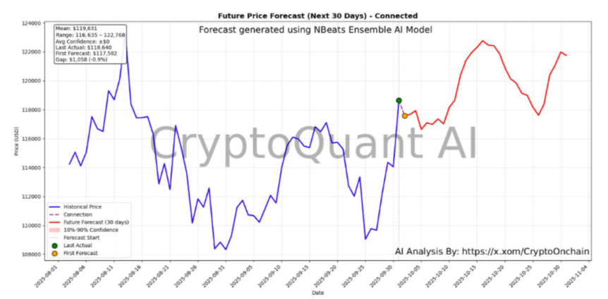 While traders remain bullish, AI-driven analysis suggests a more subdued outlook for October. CryptoQuant’s NBeats Ensemble model, which analyzes nearly 400 onchain features, indicates that Bitcoin is likely to remain within its current range, with a slight bias toward upper half of the range. The platform highlights that the probability of a breakout remains low in the near term.