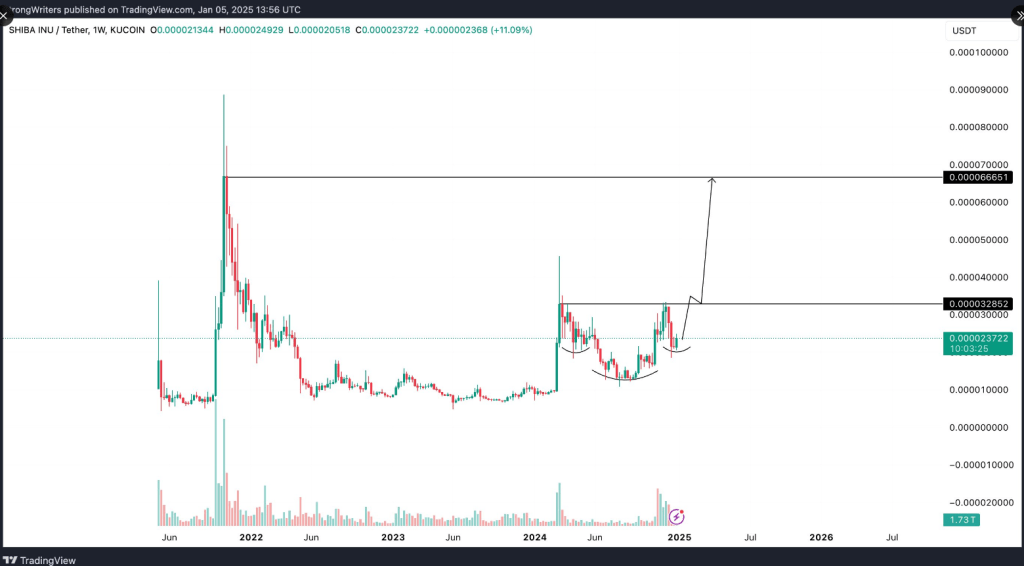 According to an analyst labeled “Strong,” signs of a cup-and-handle formation on SHIB’s weekly chart suggest a potential consolidation before a breakthrough. Drawing from historical resistance levels, a projected target of $0.000066 post-breakout highlights optimistic possibilities.