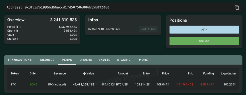 Meanwhile, large Bitcoin whales are demonstrating renewed bullish sentiment. After Bitcoin’s recent dip to approximately $104,000, several whales have taken powerful long positions on decentralized exchanges, indicating confidence in a potential rally. Notably, whale wallets “0x3fce” and “0x89AB” significantly increased their holdings and leverage, signaling institutional or high-net-worth investor optimism.