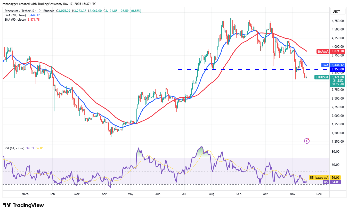 Ethereum (ETH) remains below the breakdown level of $3,350, yet the bulls have not allowed the price to fall below $3,000. A rally to the 20-day EMA ($3,444) is possible but faces selling pressure, and a sharp drop below $3,000 could see ETH decline to $2,500.