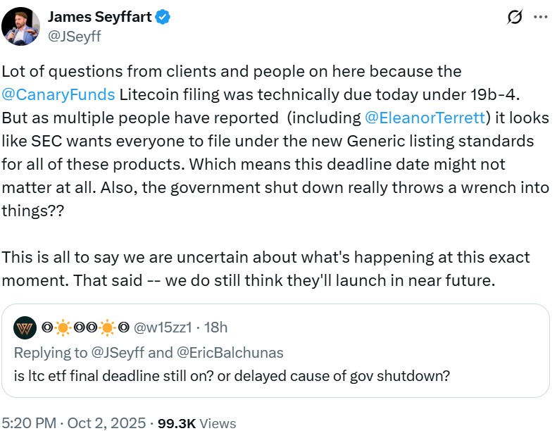 However, the shutdown is likely to impede the SEC’s review of key crypto ETF proposals, including those involving Litecoin, Solana, and XRP. While analysts express confidence that altcoin ETFs will eventually gain approval, approval processes are expected to slow until the government resumes normal operations.