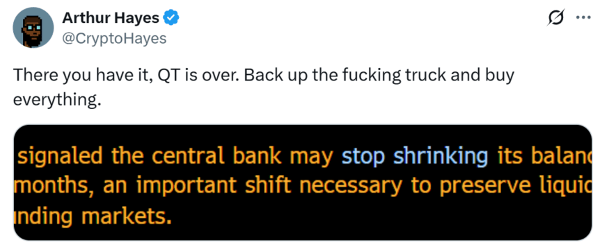 Lower rates typically stimulate risk assets, including cryptocurrencies, by reducing borrowing costs and encouraging investment. Besides rate cuts, the Fed’s planned cessation of its quantitative tightening (QT) program on December 1 could lead to an influx of liquidity into the markets, further supporting crypto prices.