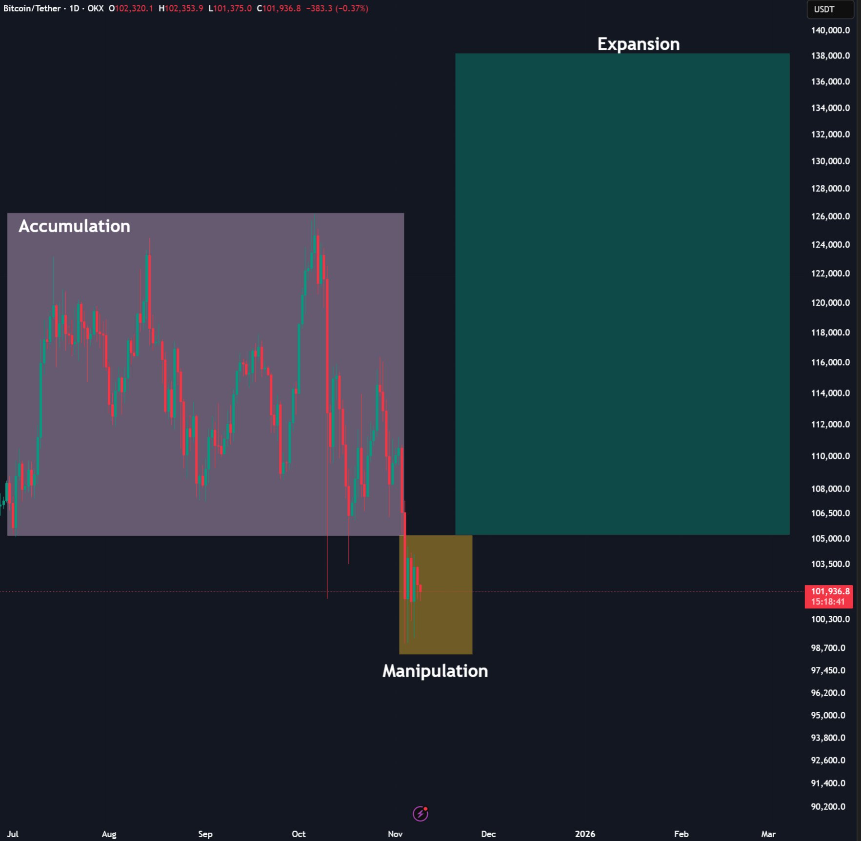 “BTC is still consolidating around $102,000. The markets expected the shutdown to end this weekend, but that didn’t happen,” he said, adding, “I still think Bitcoin could go a bit lower, given that institutional demand has waned and OG whales are selling.”