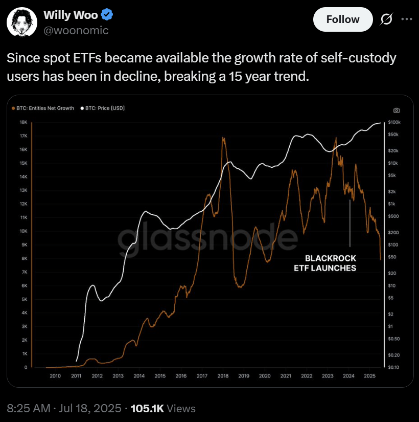 While ETFs and self-custody serve different investor segments, some analysts, like Willy Woo, warn that this has may have drawn interest away from independent holdings. On-chain data recently indicated Bitcoin self-custody has declined from its longstanding uptrend, hinting at changing investor preferences.