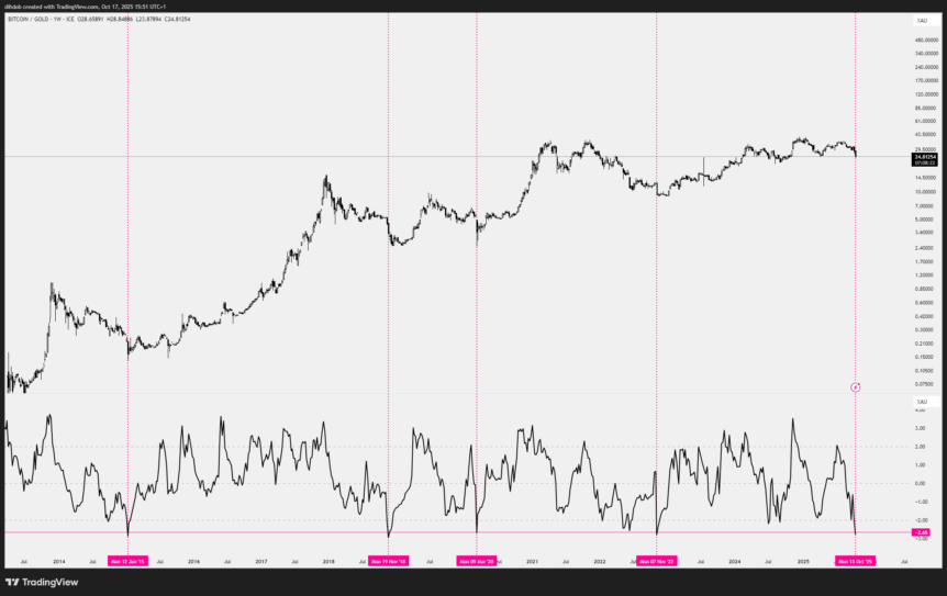 The Bitcoin-to-gold ratio has fallen to levels reminiscent of previous market bottoms in 2015, 2018, 2020, and 2022, each followed by rallies exceeding 100%. Currently dipping below -2.5, the ratio suggests Bitcoin might be undervalued, setting up a potential bullish run.