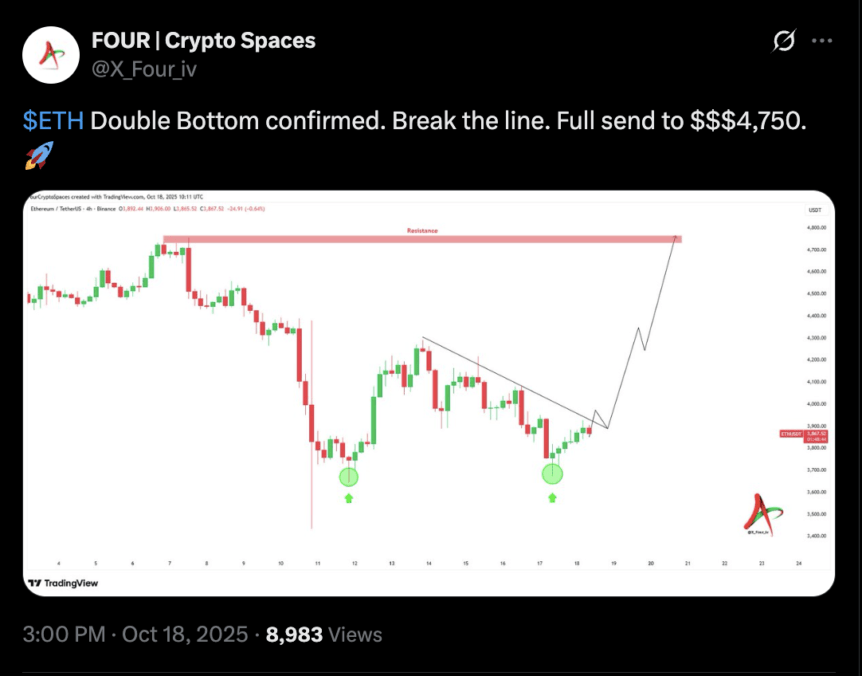 The recent bounce off the channel’s lower boundary near $3,500 aligns with support from the 200-day exponential moving average (EMA), a historically strong foundation during bullish phases. If this momentum persists, ETH could break upward toward the channel’s upper resistance near $4,500 in October, further fueled by the bullish double bottom pattern that signals a potential rally to $4,750, as indicated by analyst insights.
