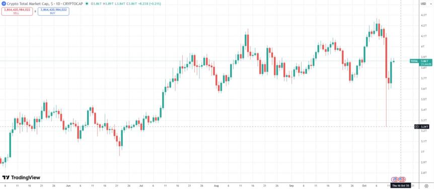The event included Bitcoin’s first-ever $20,000 red candle and a $380 billion market cap drop, before a V-shaped rebound as traders closed short positions. According to TradingView data, the liquidation was nine times larger than previous records, highlighting the intense leverage unwinding typical in crypto markets after periods of excessive speculation.