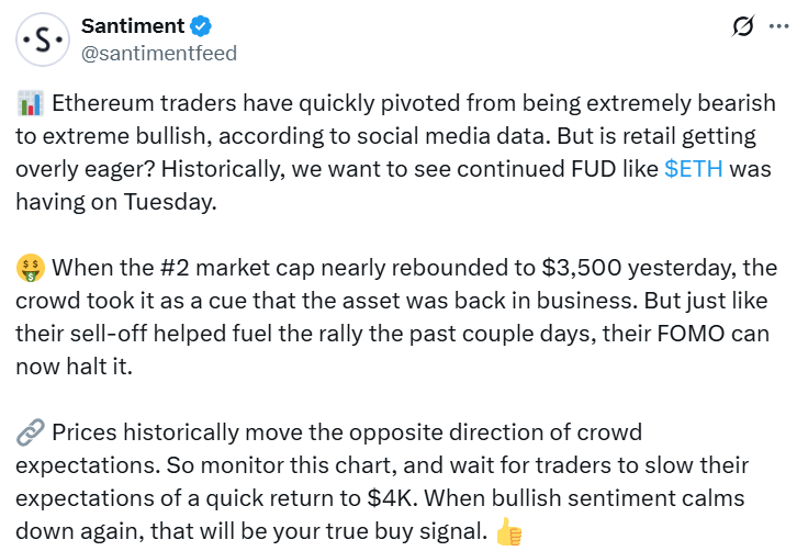 “Ethereum traders have quickly pivoted from being extremely bearish to extreme bullish,” Santiment commented, adding that the price rebound toward $3,500 signaled to the crypto community that ETH was regaining strength. This shift in sentiment is reflected in public discussions and market behavior, with traders feeling more optimistic about Ethereum’s near-term trajectory.