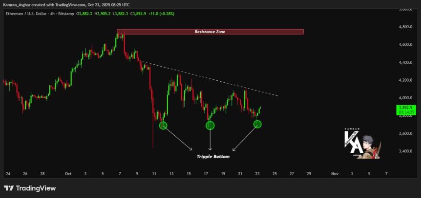 On Thursday, ETH’s 4-hour chart revealed a classic triple bottom, a pattern that develops when the price tests the same support level roughly three times without breaking lower. This support zone hovers around $3,750–$3,800, where consistent buying has prevented further declines. Each attempt to push lower has weakened sellers, indicating a possible shift in momentum towards buyers.