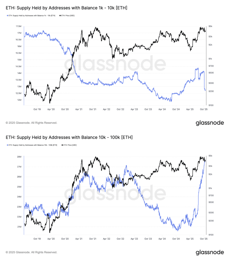 During the same period, mid-sized holders with 1,000–10,000 ETH experienced notable declines, especially amid the recent price correction. This suggests either that these holders sold into the dip or increased their positions, transferring coins into the larger whale category.
