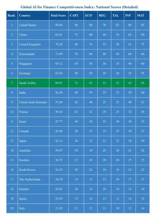 - Saudi Arabia ranks 7th globally, cited as the Gulf’s fastest-scaling market for AI-enabled finance.