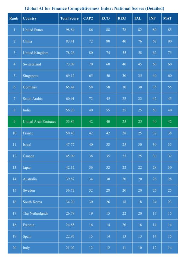 The UAE stands out not only for its technological capability but also for its ability to turn AI potential into operational financial systems. This unique combination of state-driven AI development, a globally oriented financial ecosystem, and robust institutional execution makes the UAE a front-runner in deploying AI in regulated financial markets. As a “system builder,” the UAE competes not on the sheer volume of research output but on its speed of AI adoption, regulatory modernization, and efficient deployment pathways. Its ability to rapidly implement AI programs, set clear regulatory frameworks, and scale AI-powered financial tools has positioned it as a global testbed for finance-grade AI.
