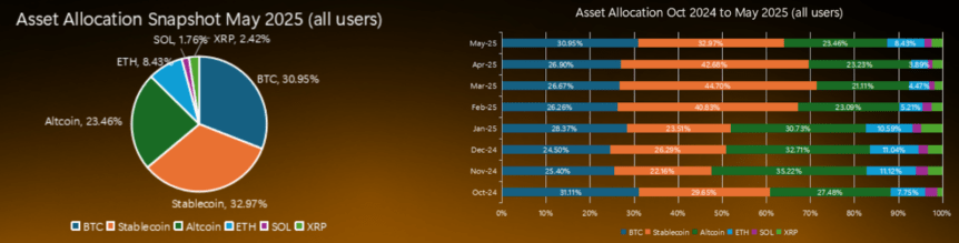 In May, Bitcoin accounted for nearly 31% of total assets in investor portfolios, up from 25.4% in November 2024, indicating growing institutional and retail acceptance.