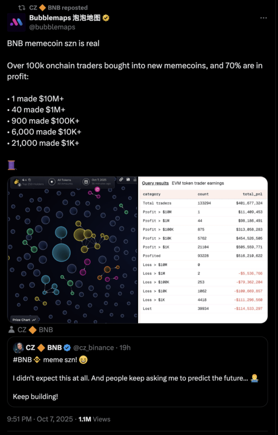 Four.Meme’s daily revenue now exceeds that of Pump.fun, with approximately 70% of traders in profit, reflecting strong activity within the BNB ecosystem.