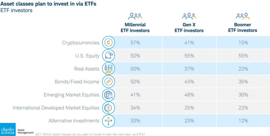In its “ETFs and Beyond” study, Schwab found that 52% of respondents plan to invest in US equities, while 45% expressed a similar interest in crypto ETFs—tied with US bonds for second place. Bloomberg’s senior ETF analyst Eric Balchunas noted that this was unexpected, considering the bond market’s size.