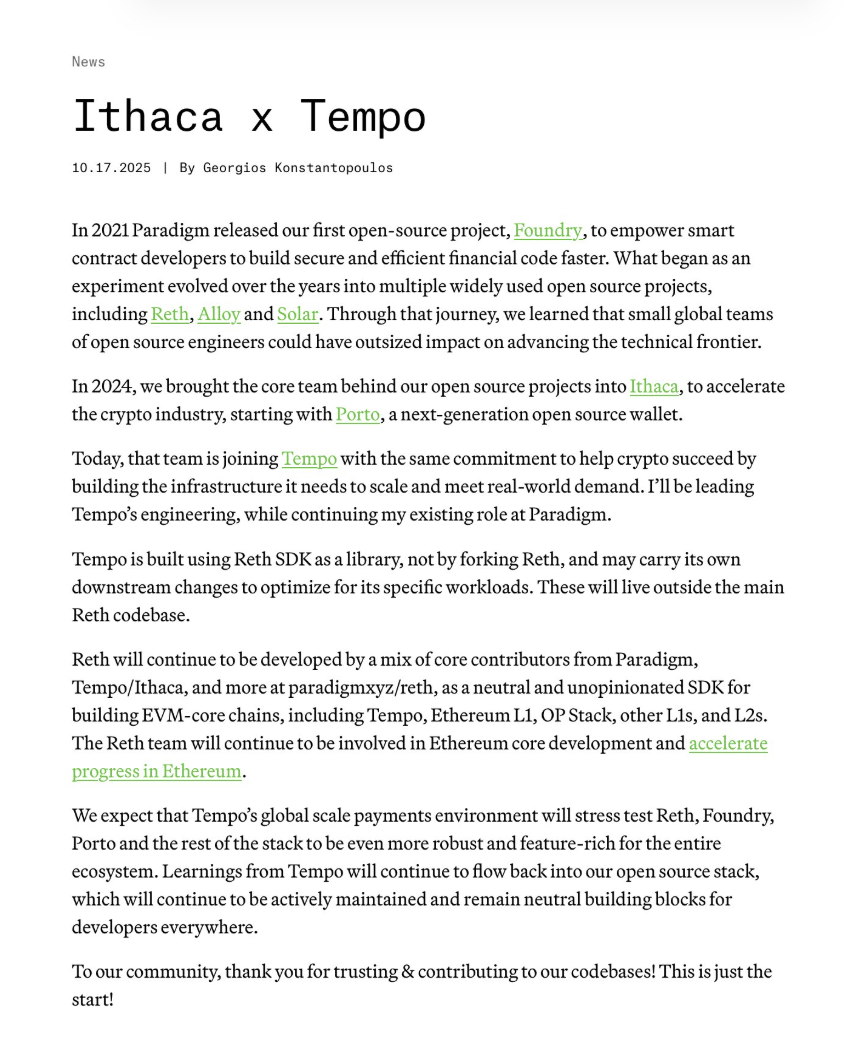 Though no specific launch date has been announced, Paradigm CTO Georgios Konstantopoulos shared that the core team behind Ithaca, its open-source blockchain projects, has joined Tempo to help develop its payment infrastructure and enhance scalability.